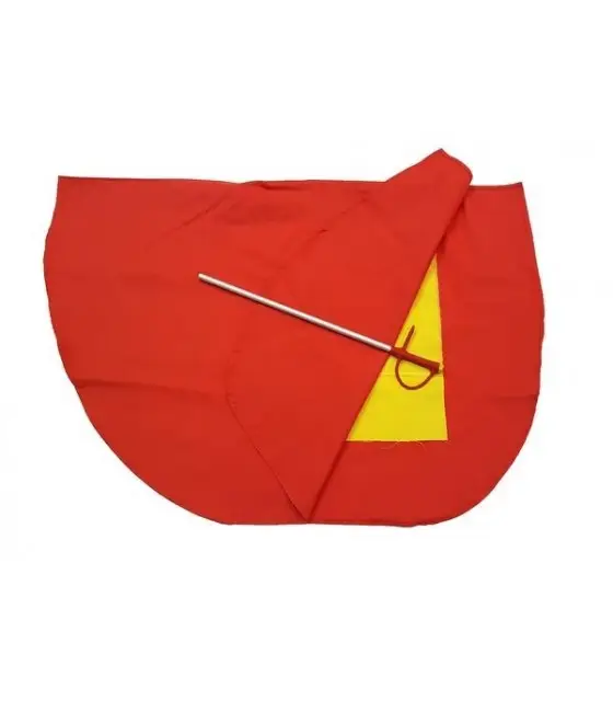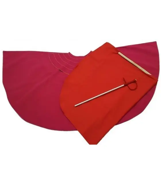 Pack de muleta y capote de niño. La muleta está confeccionada en tela sintética lavable de color rojo con forro interior de color amarillo. Incluye todo lo necesario para que los niños realicen sus primeros pases taurinos.